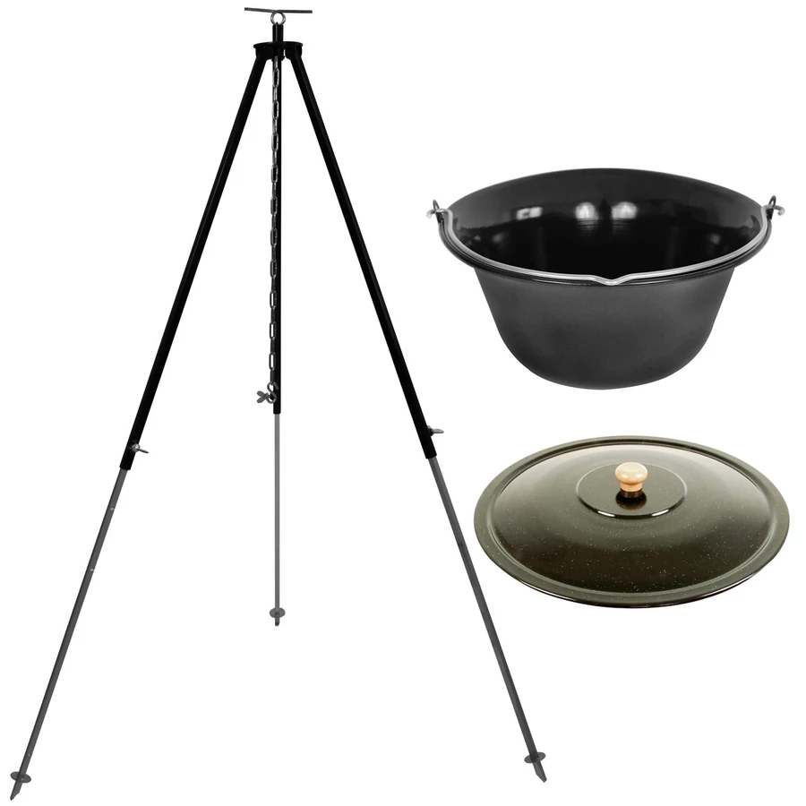 Fekete zománcozott bogrács 30 literes, fedővel, 180 cm-es teleszkópos állvánnyal